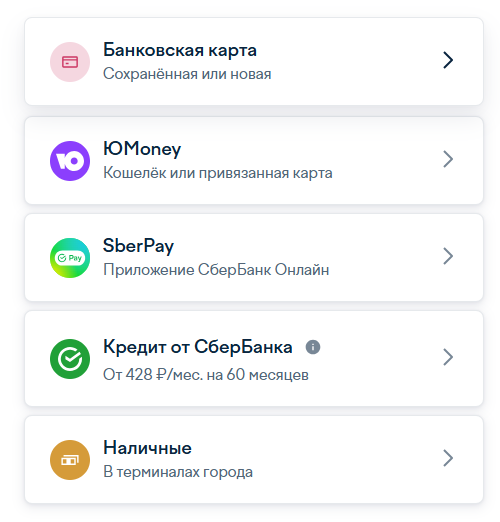 На нашем сайт подключен платежный агрегатор ЮКасса, который дает возможность оплаты различными способами.